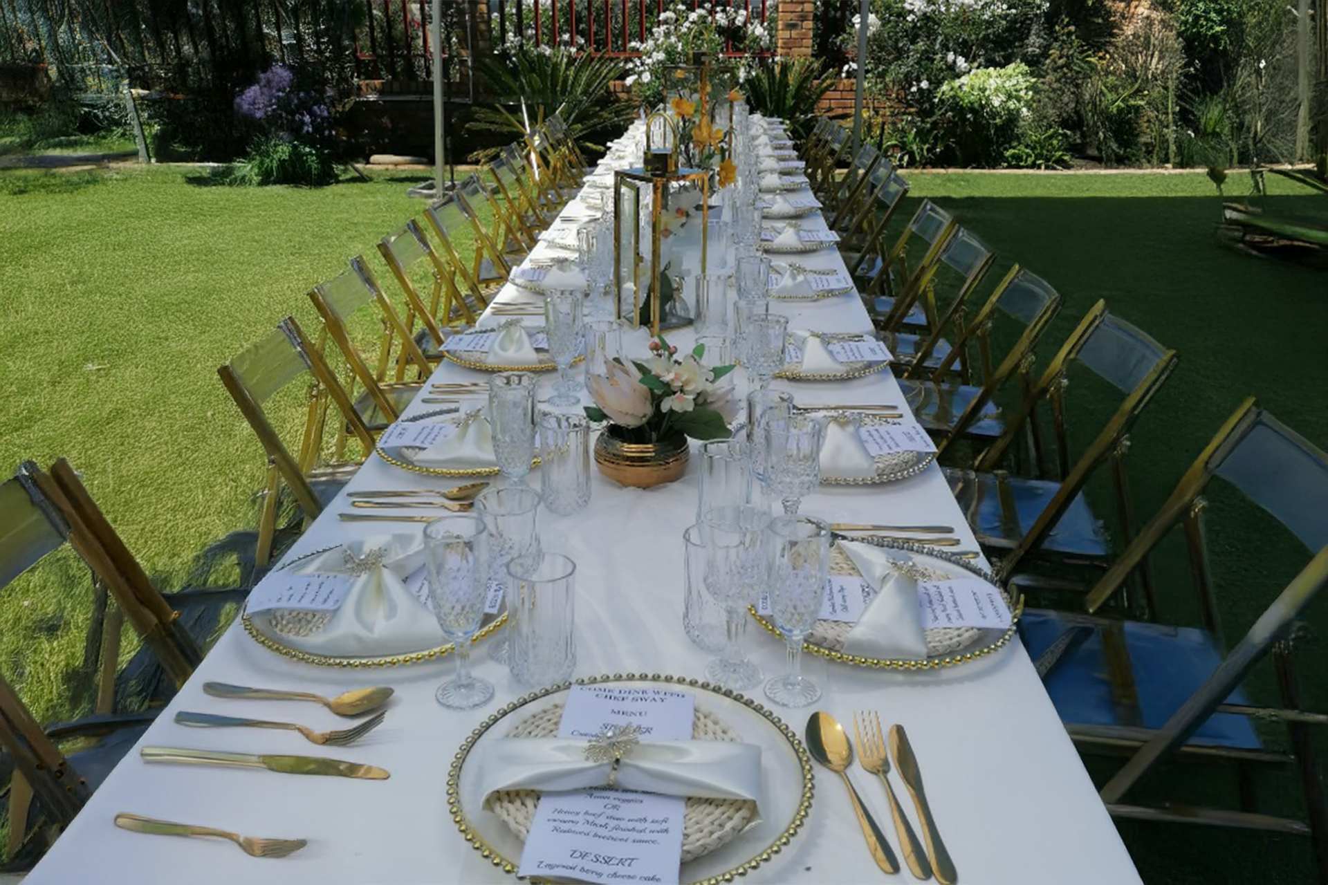 It goes without saying that everyone enjoys being in beautiful surroundings, which presents the perfect opportunity for our event décor team to transform the indoor or outdoor space that you will host your event in. We have 10-seater round tables, glass rectangular tables, couches, café tables and chairs, cocktail chairs and tables, rectangular trestle table which can be joined together to make long harvest-style tables, striking backdrops with or without balloon garlands (for those epic photo moments), and lots more. Our table décor ranges from fresh flower arrangements, stylish rose gold lanterns, glass/gold/silver candelabras and lots more.